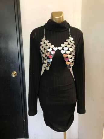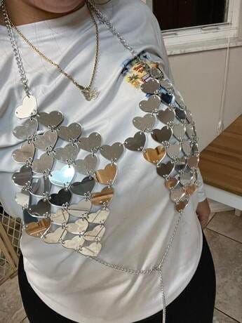 This silver crystal overwear features a sleek bra-style silhouette accented with radiant chains that reflect light beautifully. The cut-out design enhances the upper body, creating a confident and fashion-forward look that elevates both casual and party outfits.